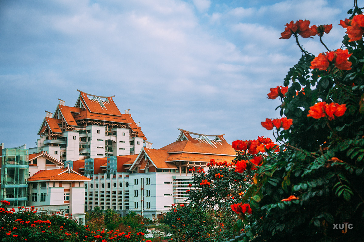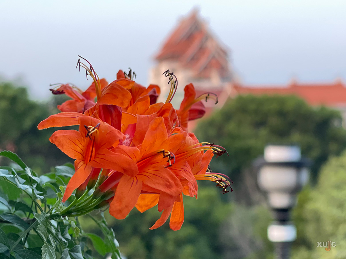 對廈門大學嘉庚學院的師生來說,5月是徜徉在校園里美麗花世界的浪漫初夏。該校目前擁有植物(不含室內盆栽植物和校園菜地蔬菜)515種,隸屬于126科382屬。值得一提的是,其中有不少植物界“勞模”,它們四季飄香,花開不斷,持續(xù)為師生放送美好。圖中是火焰木,花色如火焰,寓意無憂無愁、吉祥美麗。(朱鮮艷 攝)