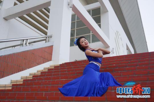 女大學生在圖書館的?;諛俗R前翩翩起舞。 馬晨晨 攝