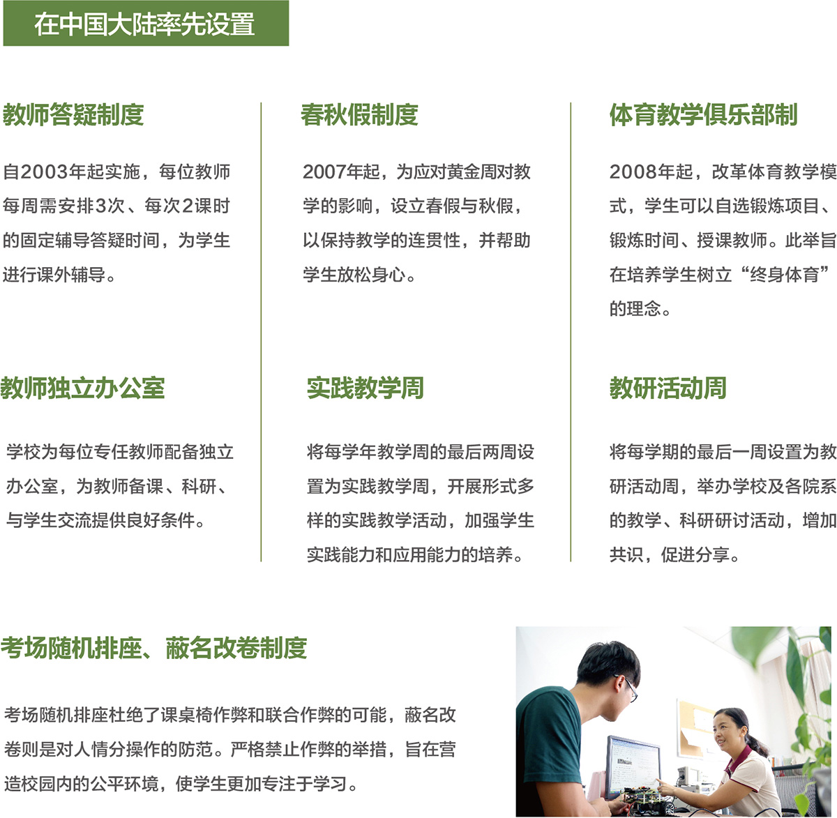 嘉庚學(xué)院以人為本,全力營(yíng)造因材施教、因勢(shì)利導(dǎo)、尊重個(gè)性、激發(fā)潛能的教育環(huán)境。學(xué)校不斷強(qiáng)力推進(jìn)教育教學(xué)改革,完善人才培養(yǎng)模式。尊重學(xué)子自主選擇,學(xué)校從辦學(xué)之初即執(zhí)行靈活自由的轉(zhuǎn)專業(yè)制度,允許每位在校生有一次轉(zhuǎn)專業(yè)機(jī)會(huì);考慮學(xué)子個(gè)體發(fā)展需求,學(xué)校在課程配置上靈活自由,學(xué)生可以較為自主地根據(jù)自己的進(jìn)度和興趣進(jìn)行課程修讀。學(xué)校還通過(guò)開(kāi)設(shè)國(guó)際班、創(chuàng)新創(chuàng)業(yè)孵化班,設(shè)置大學(xué)生創(chuàng)業(yè)園等方式,滿足學(xué)子個(gè)性化、多元化的成長(zhǎng)需求。