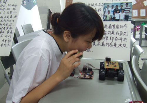 來自應(yīng)屆畢業(yè)生蔡同學(xué)設(shè)計的作品——語音控制小車,在機(jī)械結(jié)構(gòu)上,對普通的玩具小車做了改進(jìn),使小車的轉(zhuǎn)向更加靈活,采用語音控制方式,使小車可以“聽懂”人的命令,娛樂性和互動性更強(qiáng)。富于創(chuàng)新,動手能力強(qiáng),這是電子工程系一大特色。
