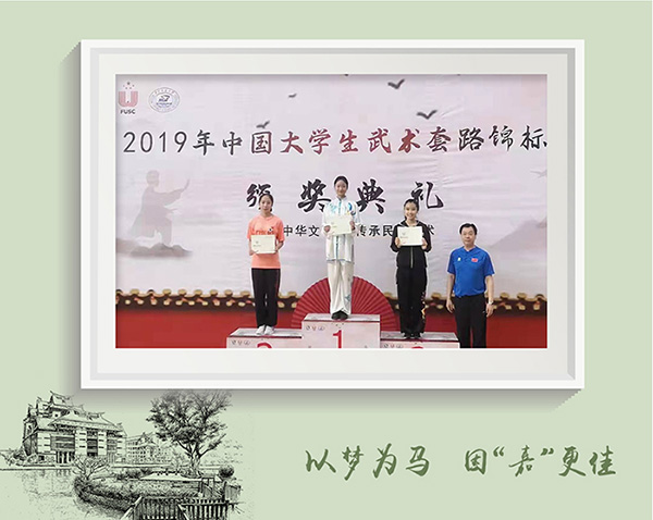 主要事跡:2019年7月,我校代表隊(duì)首次出征中國(guó)大學(xué)生武術(shù)套路錦標(biāo)賽。人文與傳播學(xué)院學(xué)子余崢秭以8.85分勇奪女子丁組42式競(jìng)技太極拳冠軍。