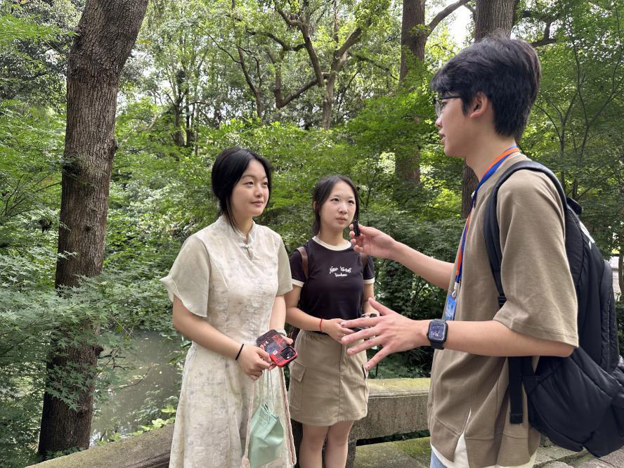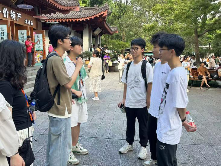 在與杭州民眾的聊天中,實踐隊隊員們調研了大家對文化傳承的期待。其中,面對來杭州研學的中學生,隊員們以“黃檗東傳”“禪茶傳日”等故事為切入點,生動解讀杭州作為“活態(tài)文化交流樣本”的價值。“原來西湖的橋影響過日本建橋”“抹茶竟然和我們的徑山茶宴有關”……中學生們的驚嘆讓隊員們明白:文化傳播不必高深,用青春語言講好故事,就能讓年輕一代觸摸到文明互鑒的溫度。