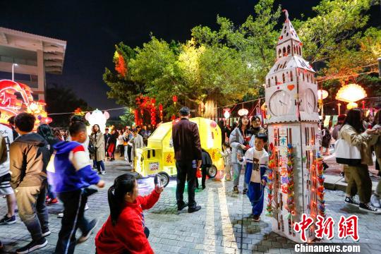 廈大嘉庚學院學生創(chuàng)意制作的“大本鐘”花燈引來游園人群爭相合影。朱鮮艷 攝