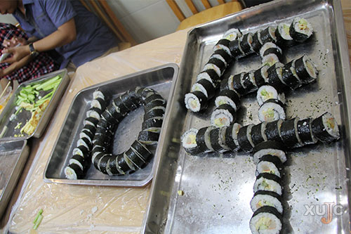 為了這場美食品嘗會,日語系還特意從日本空運回了食材。日語系的任課老師包括外教都出動準備美食。在廚房里,不會做菜的戴斌老師也在忙碌著,他說:“我不會做菜,但切壽司還是沒問題的。”