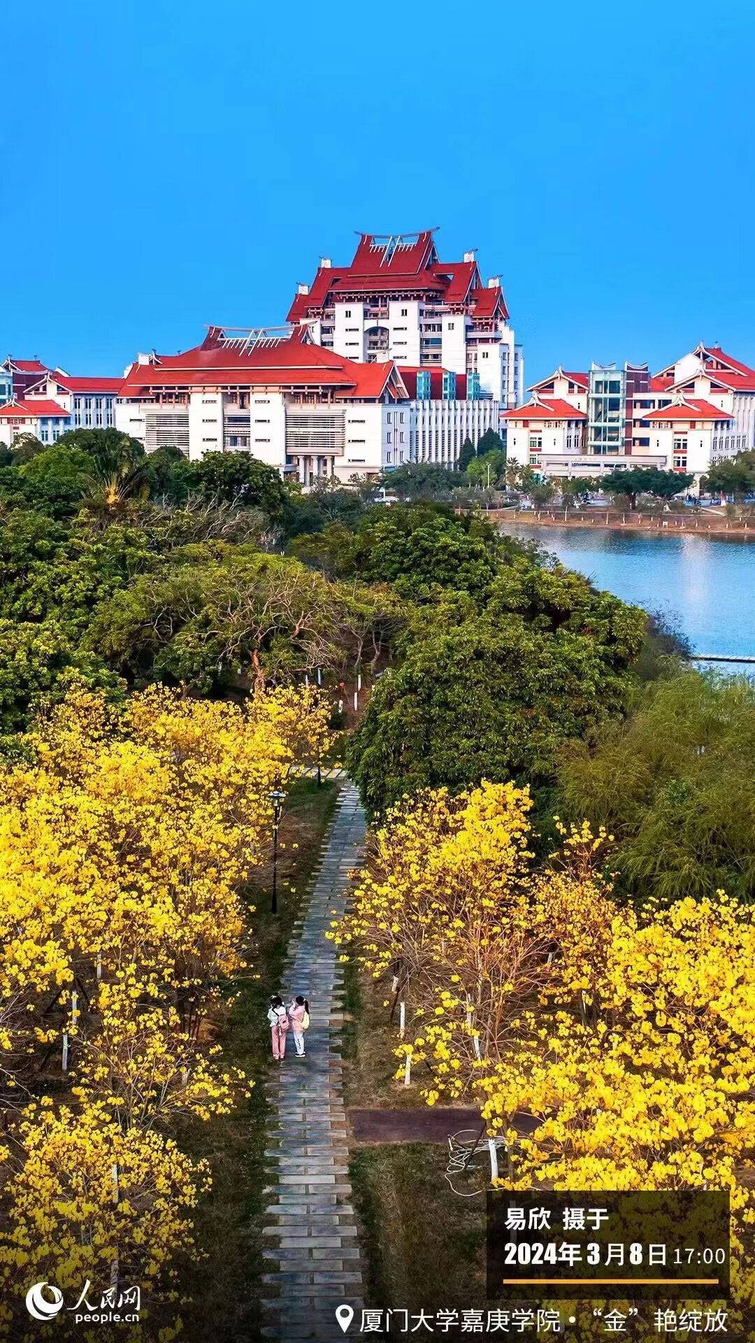 賞大片,有大美。3月11日,人民網(wǎng)福建頻道圖片欄目“遇見福建之美”刊發(fā)我校人文與傳播學院易欣副教授拍攝的“嘉園”春日風光,并取名《廈門大學嘉庚學院 •“金”艷綻放》。