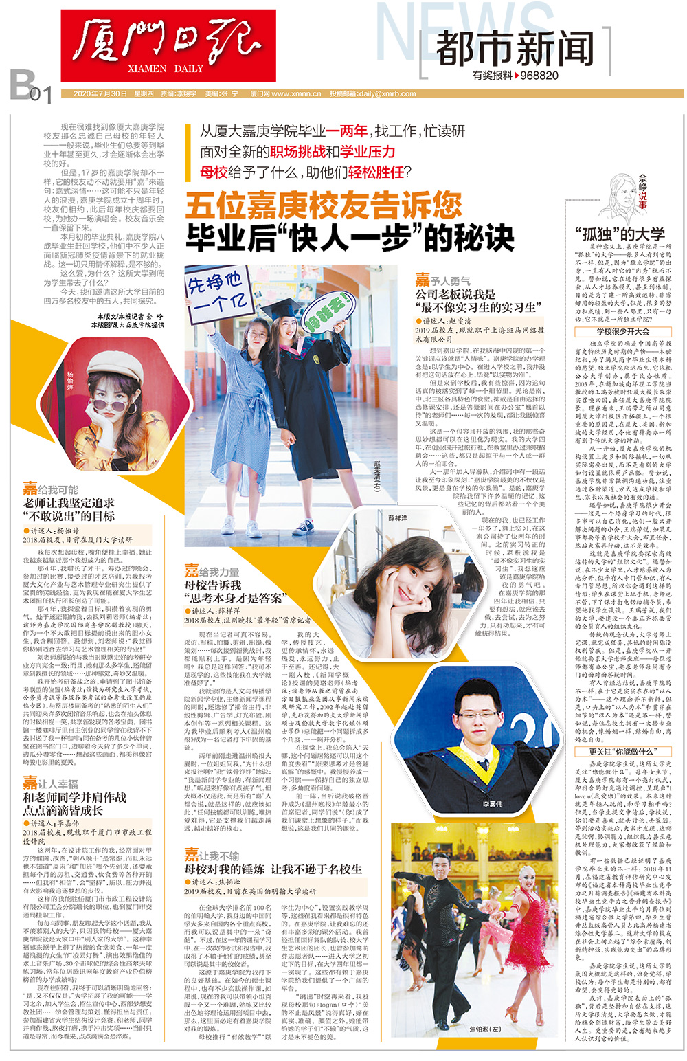 從母校畢業(yè)一兩年,找工作、忙讀研,面對(duì)全新的職場(chǎng)挑戰(zhàn)和學(xué)業(yè)壓力,母校給予了什么,助他們輕松勝任?2020年畢業(yè)季,廈門(mén)日?qǐng)?bào)用專版講述了我校5位校友的故事,解密他們畢業(yè)后“快人一步”的秘訣。