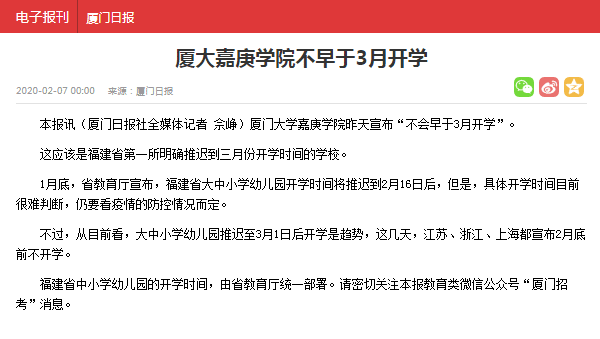此消息經(jīng)廈門(mén)日?qǐng)?bào)以《福建省第一所明確推遲到三月份開(kāi)學(xué)的學(xué)校來(lái)了!廈大嘉庚學(xué)院:不早于3月開(kāi)學(xué)》為題首發(fā)報(bào)道后,獲廣泛轉(zhuǎn)發(fā)。