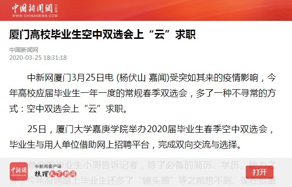 和往年不同,這次雙選會(huì)“騰云”而來(lái),中國(guó)新聞網(wǎng)、福建日?qǐng)?bào)、廈門(mén)日?qǐng)?bào)等媒體紛紛以《求職,“云”上見(jiàn)》給予關(guān)注。