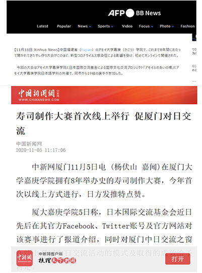 因?yàn)橐咔榈挠绊懀?020年不僅課堂搬上“網(wǎng)”、招聘會(huì)騰著“云”,連比賽也有“線上”版。在我校擁有8年舉辦史的壽司制作大賽,2020年夏天首次以線上方式進(jìn)行。此舉不僅獲日本國(guó)際交流基金會(huì)發(fā)Facebook、Twitter介紹,還吸引中國(guó)新聞網(wǎng)、新華社日文專線、法新社日文專線發(fā)文點(diǎn)贊。