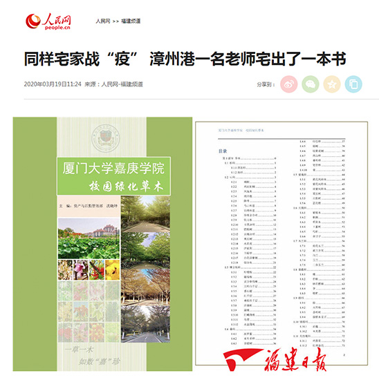 該書(shū)是基于我校歷時(shí)兩年的校園植物資源全面普查而來(lái),共收錄88科217屬289種有代表性的綠化植物。包括人民網(wǎng)、中國(guó)新聞網(wǎng)、福建日?qǐng)?bào)在內(nèi)的多家媒體給予關(guān)注,并以《同樣宅家戰(zhàn)“疫” “嘉”人宅出了一本書(shū)》為主題進(jìn)行報(bào)道。