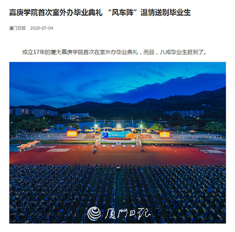 2020年7月4日傍晚,我校在田徑場(chǎng)舉辦2020屆本科生畢業(yè)典禮暨學(xué)位授予儀式。受新冠肺炎疫情影響,我校創(chuàng)辦17年來(lái)首次在室外舉辦畢業(yè)典禮。風(fēng)車陣、紅月亮、“陳嘉庚”星……“越是特殊時(shí)期,越是困難,越要想盡辦法把母校的愛(ài)與溫暖傳遞給每一位畢業(yè)生……”盡顯用心的畢業(yè)典禮吸引了人民日?qǐng)?bào)、廈門(mén)日?qǐng)?bào)、海峽導(dǎo)報(bào)、廈門(mén)晚報(bào)、東南網(wǎng)、泉州網(wǎng)等多家媒體關(guān)注。
