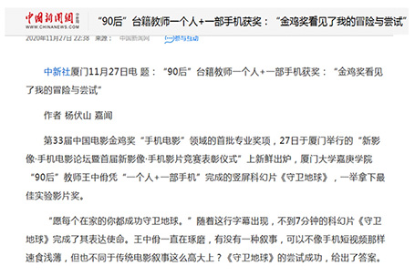 2020年11月27日,第33屆中國(guó)電影金雞獎(jiǎng)“手機(jī)電影”領(lǐng)域的首批專業(yè)獎(jiǎng)項(xiàng)在廈門(mén)新鮮出爐,我校“90后”教師王中佾憑“一個(gè)人+一部手機(jī)”完成的豎屏科幻片《守衛(wèi)地球》,一舉拿下最佳實(shí)驗(yàn)影片獎(jiǎng)。中國(guó)新聞網(wǎng)、福建日?qǐng)?bào)、廈門(mén)日?qǐng)?bào)、學(xué)習(xí)強(qiáng)國(guó)廈門(mén)平臺(tái)、廈門(mén)晚報(bào)、海峽導(dǎo)報(bào)、泉州網(wǎng)等媒體紛紛給予關(guān)注,或報(bào)道轉(zhuǎn)發(fā),或人物專訪。