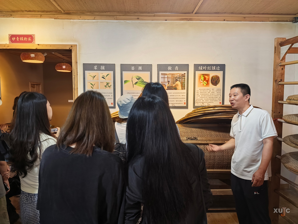 “朱子一生求索真理,制茶人也在反復(fù)打磨中,探尋巖茶滋味的最優(yōu)解”,在炒青揉捻區(qū),師生們圍站在制茶工藝展板前,聆聽(tīng)茶師講解鮮葉采摘遵循的時(shí)令規(guī)律,萎凋過(guò)程對(duì)葉片水分的微妙把控,做青環(huán)節(jié)搖青與靜置的交替……一道道工藝?yán)锊刂?ldquo;格物致知”智慧,讓學(xué)子們直觀感受到傳統(tǒng)技藝?yán)锍恋淼慕承摹?/p>