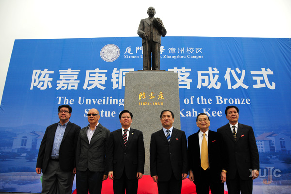 2013年4月4日清明節(jié)上午11時(shí),廈門(mén)大學(xué)漳州校區(qū)陳嘉庚銅像落成典禮在涌泉池前舉行。廈門(mén)大學(xué)校長(zhǎng)朱崇實(shí)在致辭中簡(jiǎn)單回顧了陳嘉庚先生一生的光輝業(yè)績(jī)以及創(chuàng)辦廈門(mén)大學(xué)的故事。廈門(mén)大學(xué)黨委書(shū)記楊振斌,校長(zhǎng)朱崇實(shí),校友總會(huì)理事長(zhǎng)王豪杰,菲律賓校友會(huì)名譽(yù)理事長(zhǎng)邵建寅,陳嘉庚先生之孫陳立人、陳君寶共同為陳嘉庚銅像揭幕并敬獻(xiàn)花籃。參加典禮各界人士及全體師生代表向陳嘉庚先生銅像三鞠躬表達(dá)緬懷之情。典禮后,許多同學(xué)仍不舍離去,紛紛在陳嘉庚銅像下瞻仰、合影留念,表達(dá)嘉庚學(xué)子對(duì)校主的崇敬與緬懷之情。