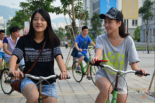 迎新日,不少新生和家長整理好宿舍之后,就騎起“小綠”逛起了校園。來自新疆的買子宸,在報到之后,就拿著學院發(fā)的廈門大學漳州校區(qū)平面圖和父母逛起了校園,他們還在主樓前合影留念。