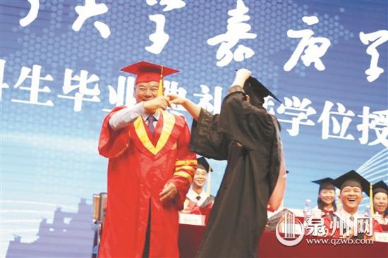從7月7日開始,廈大嘉庚學(xué)院舉行畢業(yè)典禮,送別2018屆的4133名畢業(yè)生。一天三場,連開三天,共九場,原本是為傳承一個(gè)美好儀式而設(shè)——由校長王瑞芳親手為每一位畢業(yè)生援正學(xué)位帽流蘇。要知道,4000多次的彎腰、抬手、擁抱、合影,這樣的“體測”縱然甜蜜也難以在一天,甚至一場完成。