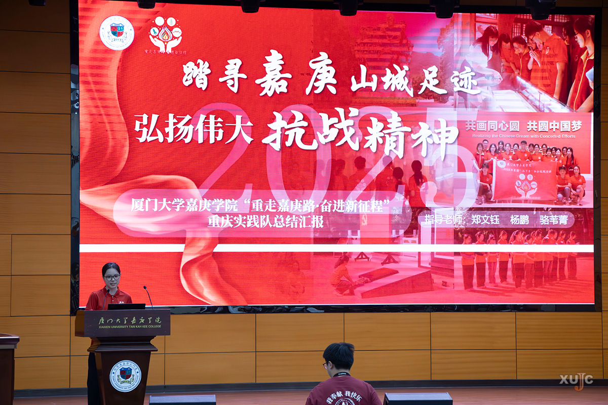 “重走嘉庚路·奮進新征程”實踐隊隊長陳詩欣分享了他們今年暑期“三下鄉(xiāng)”在重慶的社會實踐所見所聞、所思所感。他們通過重走陳嘉庚山城足跡,探尋重慶抗戰(zhàn)遺址,走進紅巖精神孕育地,傳承弘揚偉大抗戰(zhàn)精神、嘉庚精神和紅巖精神。實踐歸來,他們沒有停下腳步,而是在陳嘉庚紀念館擔任志愿講解員,將重慶的新見聞、新感悟融入陳嘉庚生平事跡的講解中,并走進廈門多個社區(qū),宣講“嘉庚心愛國情”主題微課,傳承弘揚嘉庚精神。