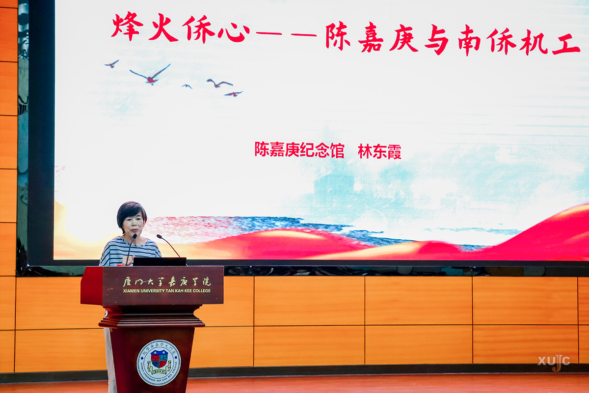 林東霞從校主陳嘉庚生平、赤子同心筑長城、應(yīng)召歸國赴使命、鐵血征途鑄豐碑四個部分展開講述。她梳理了中國抗日戰(zhàn)爭作為世界反法西斯東方主戰(zhàn)場的歷史脈絡(luò),著重闡述了陳嘉庚在抗戰(zhàn)中作出的重要貢獻,并聚焦于他組織“南僑機工服務(wù)團”支援抗戰(zhàn)以及南僑機工群體的英勇事跡。1939年2月至9月,在陳嘉庚的號召下,共有近3200名南僑機工,放棄在國外的優(yōu)渥待遇,滿懷愛國激情,發(fā)出“生是中國人,死是中國鬼”的誓言,回到祖國投身抗日衛(wèi)國戰(zhàn)爭的洪流,承擔起保障抗戰(zhàn)輸血管道——滇緬公路戰(zhàn)略物資運輸任務(wù)。他們在險峻路況、惡劣天氣、瘧疾和敵機轟炸等多重考驗下堅守使命,1800多名南僑機工永遠長眠于滇緬公路上。