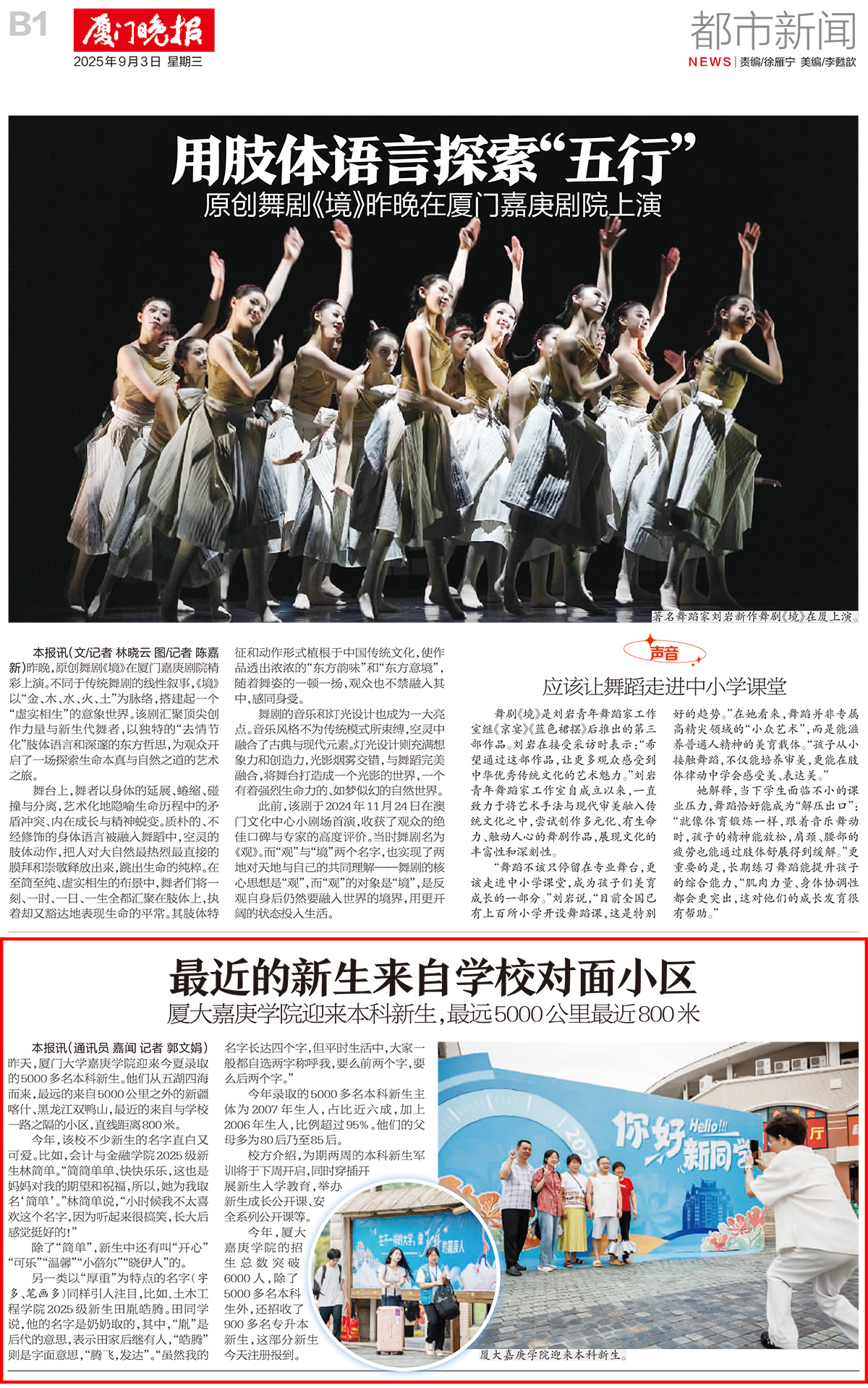 本報(bào)訊(通訊員 嘉聞 記者 郭文娟)昨天,廈門大學(xué)嘉庚學(xué)院迎來今夏錄取的5000多名本科新生。他們從五湖四海而來,最遠(yuǎn)的來自5000公里之外的新疆喀什、黑龍江雙鴨山,最近的來自與學(xué)校一路之隔的小區(qū),直線距離800米。