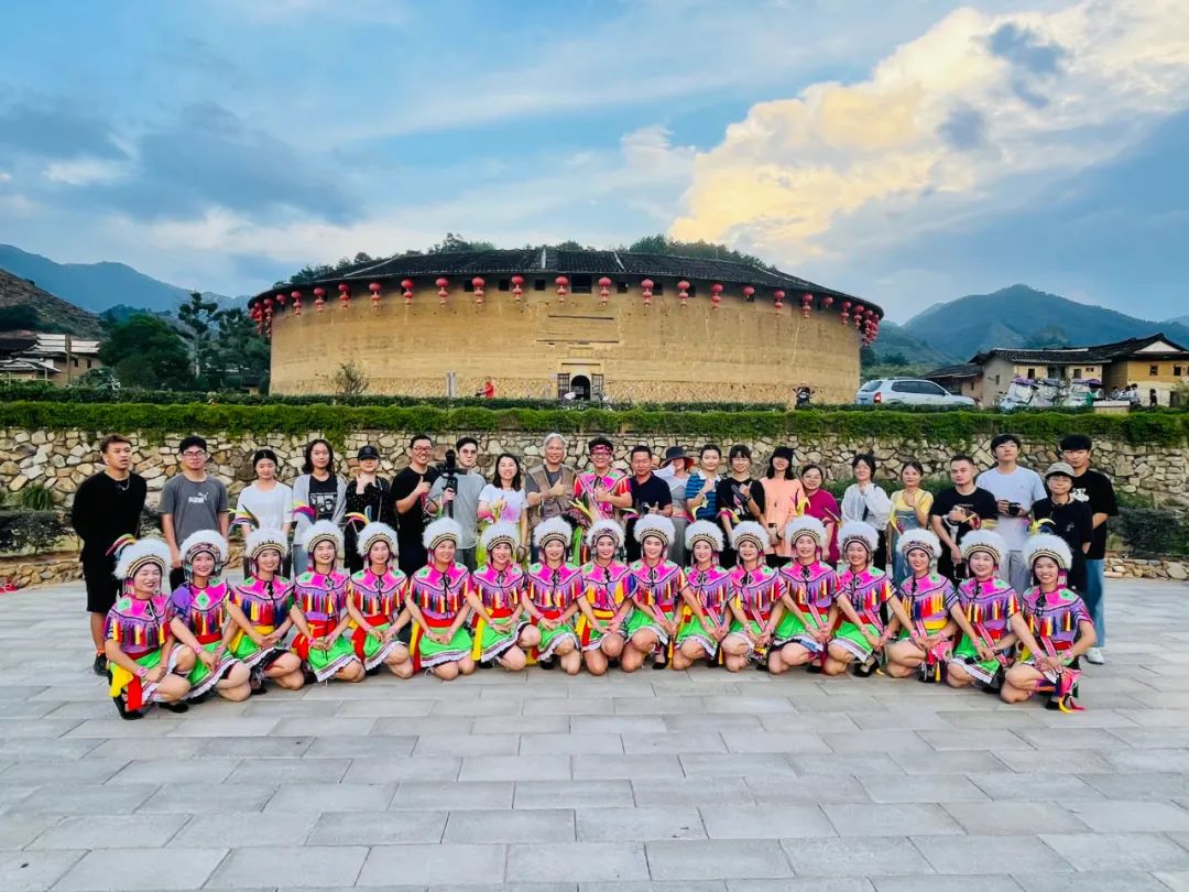 地處山區(qū)的華安九且自然村,生態(tài)環(huán)境優(yōu)美,村中尚存朝陽(yáng)樓、文峰樓、古炮樓、古井等古跡遺址。“九且耕讀園”實(shí)踐隊(duì)深入當(dāng)?shù)剞r(nóng)戶、村企、政府采訪,用文字記錄下九且的發(fā)展變化。在其他村落同步開(kāi)展教學(xué)實(shí)踐周的“土樓文創(chuàng)工作坊”“電影表演工坊”“地方影像志”三支實(shí)踐隊(duì)完成各自任務(wù)后,“行走鄉(xiāng)村”青年藝術(shù)節(jié)也順利舉辦。隨后在華安大地土樓群人民劇場(chǎng)上演的“華安土樓星光派對(duì)晚會(huì)”,吸引了當(dāng)?shù)厝罕娗皝?lái)觀看。晚會(huì)還通過(guò)華安土樓的官方微信視頻號(hào)和抖音號(hào)進(jìn)行全網(wǎng)直播。