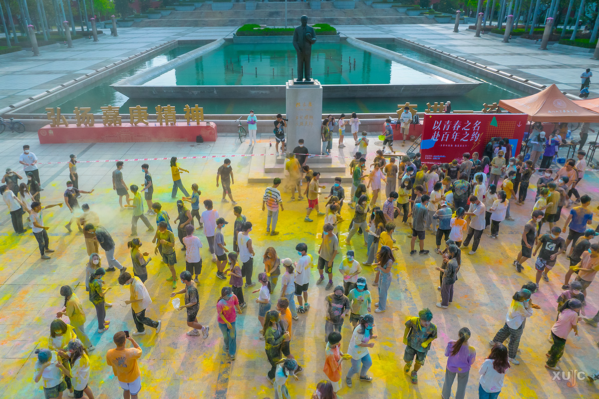 嘉庚廣場上的“彩粉大戰(zhàn)”將環(huán)校跑的歡樂氣氛推向高潮。(航拍:陶寶寶)