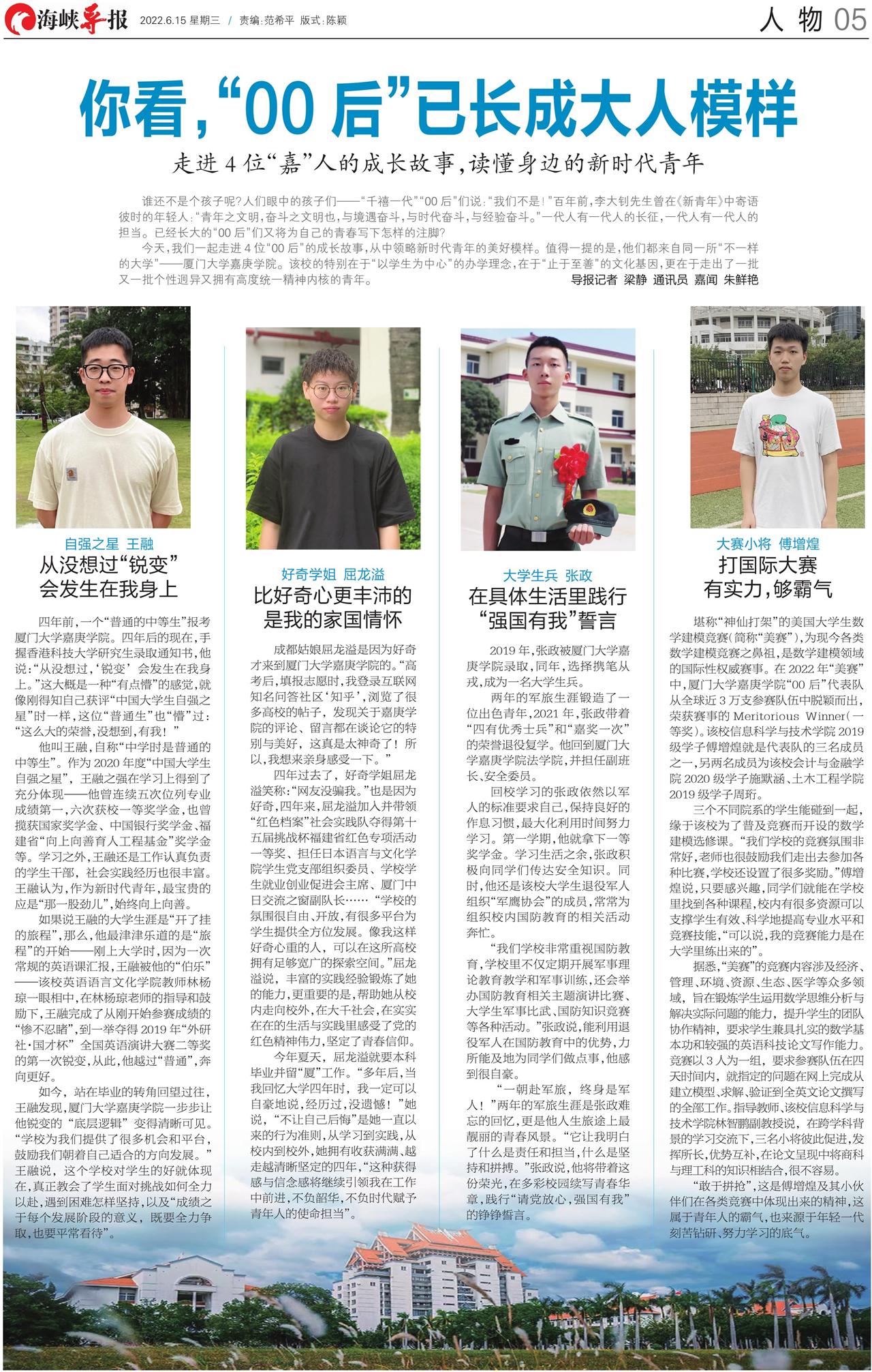 今年夏天,屈龍溢就要本科畢業(yè)并留“廈”工作。“多年后,當(dāng)我回憶大學(xué)四年時(shí),我一定可以自豪地說,經(jīng)歷過,沒遺憾!”她說,“不讓自己后悔”是她一直以來的行為準(zhǔn)則,從學(xué)習(xí)到實(shí)踐,從校內(nèi)到校外,她擁有收獲滿滿、越走越清晰堅(jiān)定的四年,“這種獲得感與信念感將繼續(xù)引領(lǐng)我在工作中前進(jìn),不負(fù)韶華,不負(fù)時(shí)代賦予青年人的使命擔(dān)當(dāng)”。