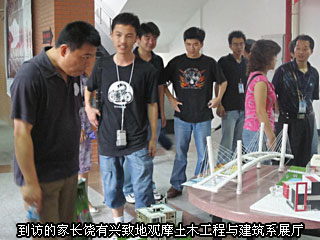 在土木工程與建筑系的展廳里,由學(xué)生自己設(shè)計并制作的各式橋梁模型以及空間、平面的設(shè)計作品吸引了不少前來參觀的學(xué)生及家長,有的來訪者還饒有興趣地跟系里的志愿者探討起同學(xué)們的設(shè)計來,據(jù)該系輔導(dǎo)員曾庭基介紹,大部分到訪的家長都有一定的目的性,特別是對該系建筑學(xué)專業(yè)很感興趣。