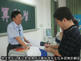 信息與計算科學(xué)系的展廳表現(xiàn)出了很濃的數(shù)學(xué)氣氛,就連宣傳欄的背景都是一條一條的公式,來這個展廳的家長和考生也是跟展廳里顯示出來的嚴謹氣氛一樣,一邊聽系主任肖筱南的解答,還一邊很認真的作著筆記。