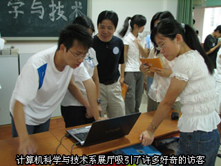 計算機科學(xué)與技術(shù)系展廳的幾臺電腦更是吸引了很多好奇的訪客,這是該系為向參觀的家長及考生展示學(xué)生專業(yè)作品所專門設(shè)置的,里面好玩的好看的不時地使這群客人對我院學(xué)生發(fā)出稱贊。