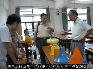 在機電工程系的展廳,家長們圍著系主任朱立秒,向他詢問一些關(guān)于課程設(shè)置、就業(yè)等方面的問題,有的家長干脆一個人悄悄地坐在座位上仔細研究該系的宣傳材料。同學(xué)們的作業(yè)以及制圖作品也使不少的家長及學(xué)生駐足觀看,據(jù)該系志愿者介紹,今年他們展廳的參觀人數(shù)比去年多了很多,僅不到一個上午的時間就已經(jīng)接待了上百個來訪者。