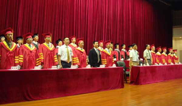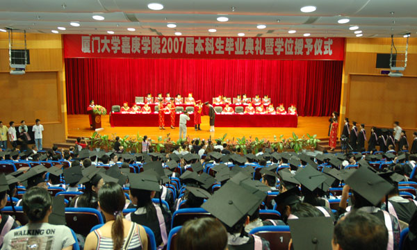 6月30日上午,廈門大學(xué)嘉庚學(xué)院2007屆本科生畢業(yè)典禮暨學(xué)位授予儀式在廈門大學(xué)漳州校區(qū)主樓群3號樓大報(bào)告廳隆重舉行。報(bào)告廳里掌聲雷動(dòng),熱鬧非凡。廈門大學(xué)黨委副書記、常務(wù)副校長潘世墨、福建省招商局漳州開發(fā)區(qū)管委會(huì)副書記張逸南、廈門大學(xué)漳州校區(qū)黨工委副書記謝銀輝、廈門大學(xué)漳州校區(qū)管委會(huì)副主任鄭樹東、廈門大學(xué)嘉庚學(xué)院院長王瑞芳、副院長戴一峰、副院長李初環(huán)、黨總支副書記張必華、畢業(yè)生所在系主任以及教師代表在主席臺就座。在臺下就座的是全體2007屆畢業(yè)生和部分畢業(yè)生家長。典禮由副院長戴一峰主持。