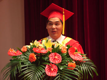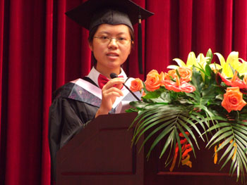 中文系主任蘇新春教授和財(cái)政金融系優(yōu)秀畢業(yè)生顏歡歡分別代表教師與畢業(yè)生發(fā)言。蘇教授肯定并祝賀了同學(xué)們所取得的成績,他相信每一位同學(xué)的未來都將為嘉庚學(xué)院的歷史添墨加彩。顏歡歡代表所有畢業(yè)生對學(xué)院領(lǐng)導(dǎo)、老師表示由衷的感謝。07屆畢業(yè)生家長代表向全體畢業(yè)生致以最熱烈的祝賀,并向?qū)W院的所有教師和員工表示感謝。