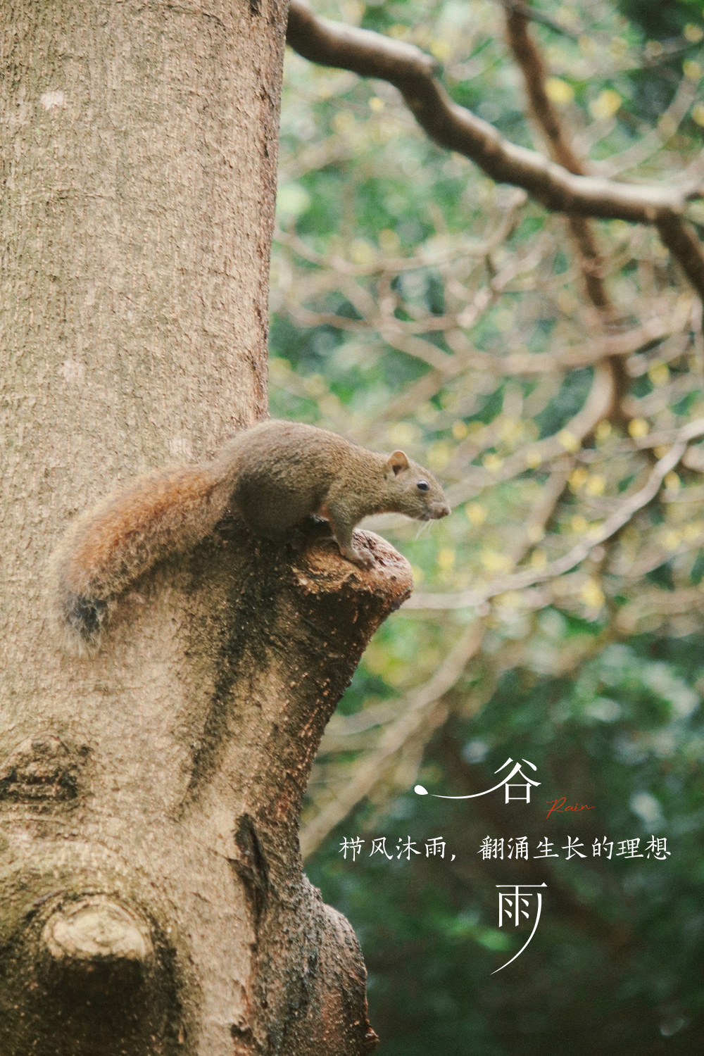在雨季里,可愛的小松鼠也悄悄前來賞景