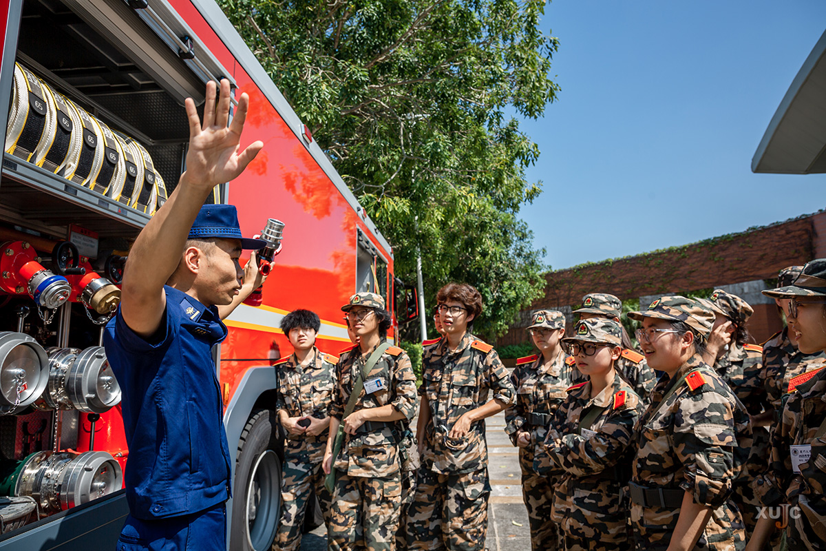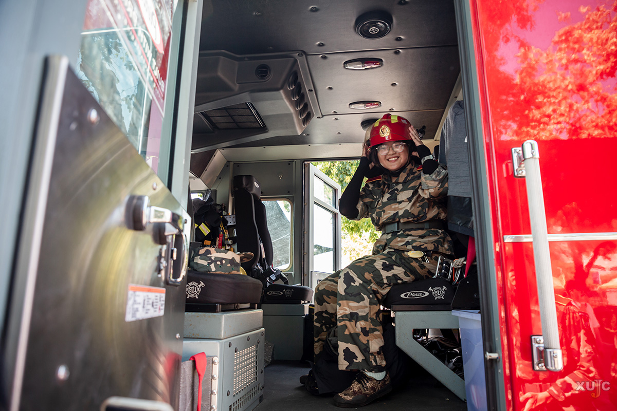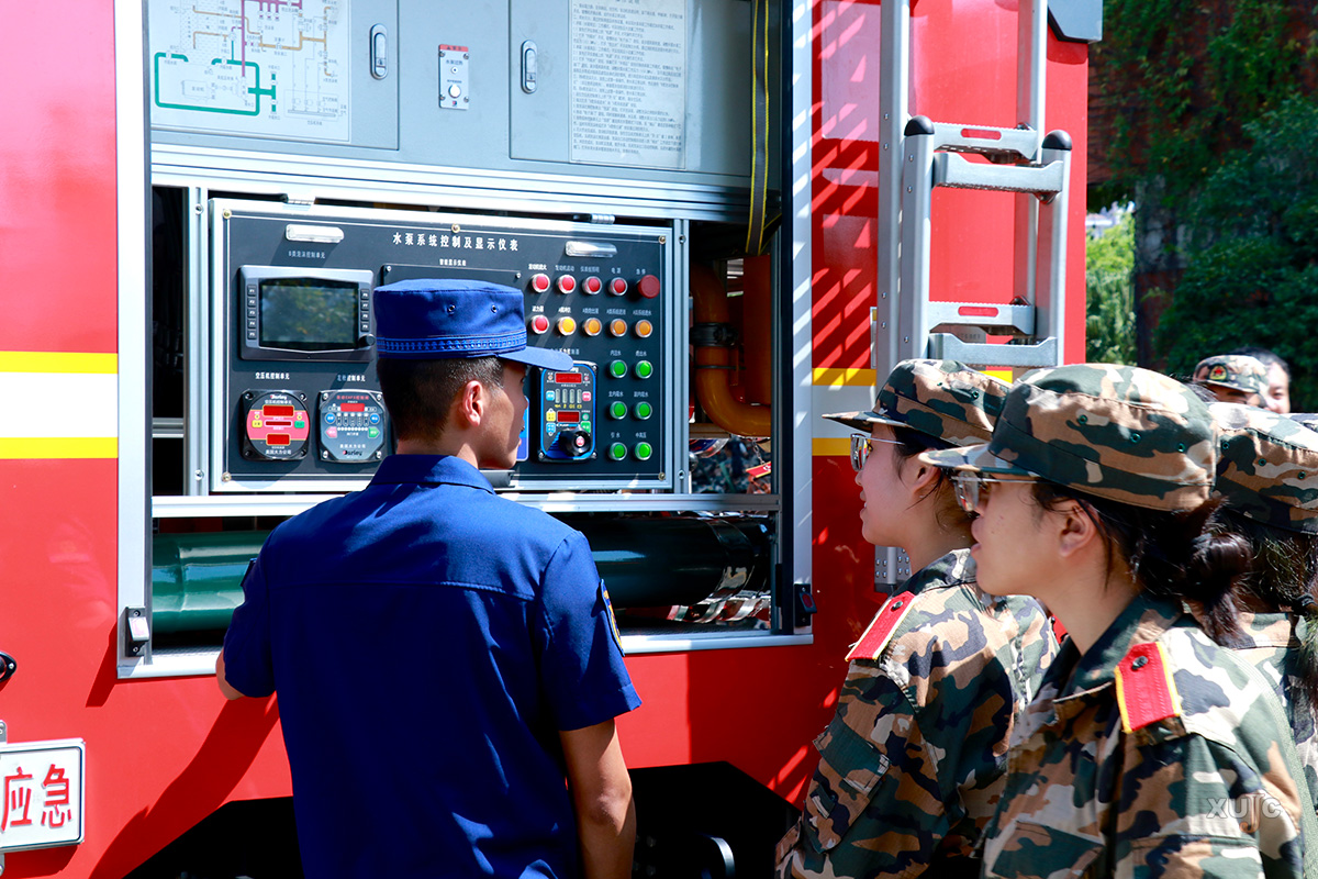 同時,活動現(xiàn)場的消防車成為了新生們關(guān)注的焦點(diǎn)。新生們有序地進(jìn)入消防車內(nèi)部參觀,近距離、直觀地了解消防車的功能結(jié)構(gòu)。