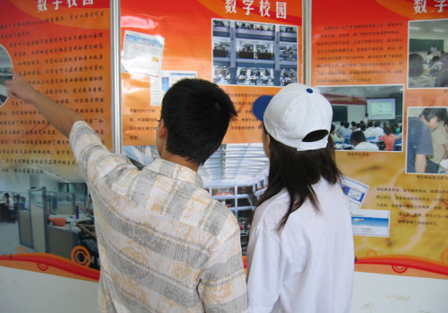 四名志愿者面帶微笑的站在大門的兩側(cè),熱情地迎接來(lái)訪者。另外一些志愿者則引導(dǎo)參觀者觀看圖片展??忌图议L(zhǎng)對(duì)學(xué)校的體制、運(yùn)作模式、教學(xué)成果、畢業(yè)狀況和學(xué)校環(huán)境等提出疑問(wèn),志愿者們都進(jìn)行了耐心與細(xì)致的說(shuō)明。