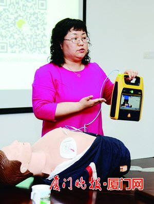 “AED是一種便攜的醫(yī)療設(shè)備,它可以診斷心室顫動,并給予電擊除顫,是可被非專業(yè)人員使用的用于搶救猝死患者的醫(yī)療設(shè)備。”昨日下午,救心圈發(fā)起人、廈大附屬第一醫(yī)院醫(yī)生林晨暉對AED進(jìn)行基礎(chǔ)講解。隨后,嘉庚學(xué)院老師、廈門紅十字會應(yīng)急救護(hù)講師楊波模擬情景,介紹這一“救命神器”如何使用。
