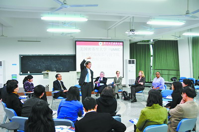 目前,學(xué)院已經(jīng)和23所海外高校建立了人才培養(yǎng)合作關(guān)系。在學(xué)院的專任教師隊伍中,活躍著來自美國、英國、日本、澳大利亞等各國的外籍教師的身影。日語系的日本外教占本系師資隊伍近二分之一,電子商務(wù)系具有海外留學(xué)經(jīng)歷的教師占了本系師資力量的三分之一。