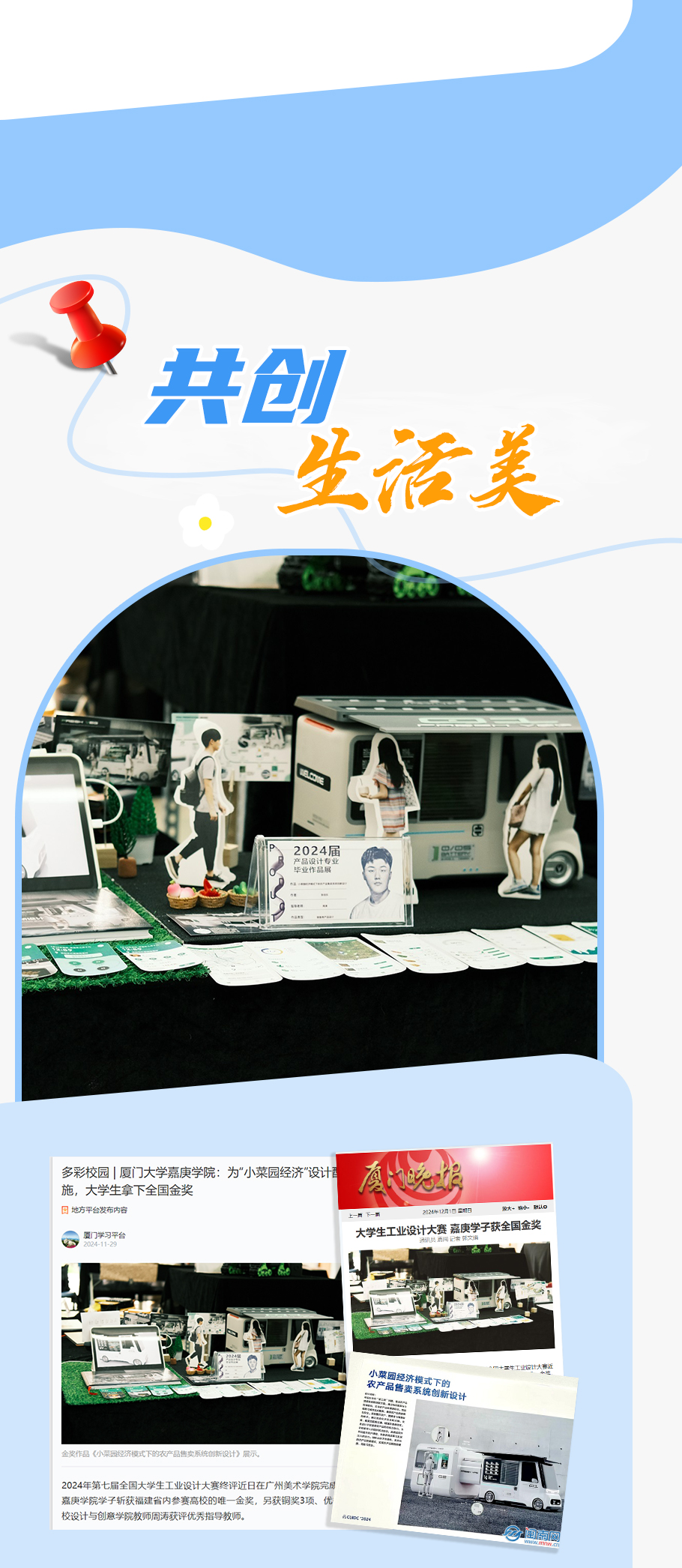 11月下旬,2024年第七屆全國(guó)大學(xué)生工業(yè)設(shè)計(jì)大賽終評(píng)在廣州美術(shù)學(xué)院完成。我校學(xué)生作品《小菜園經(jīng)濟(jì)模式下的農(nóng)產(chǎn)品售賣(mài)系統(tǒng)創(chuàng)新設(shè)計(jì)》斬獲福建省內(nèi)參賽高校的唯一金獎(jiǎng)。社會(huì)媒體在報(bào)道中表示,這個(gè)作品以選題的未來(lái)性及青年學(xué)子共創(chuàng)美好生活的主動(dòng)性,打動(dòng)了評(píng)委。