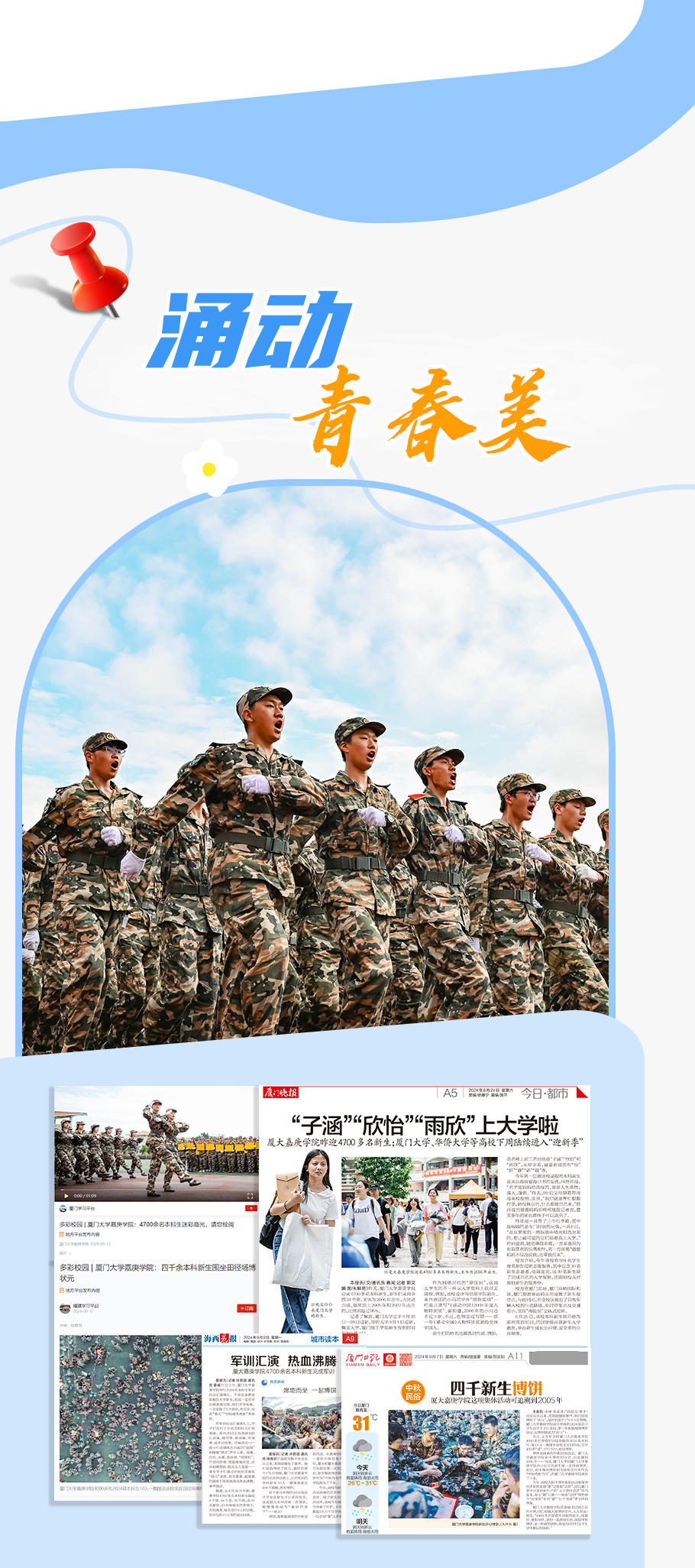 怦然“新”動(dòng)!夏秋之交,又一年迎新、軍訓(xùn)季,學(xué)習(xí)強(qiáng)國(guó)、福建日?qǐng)?bào)、廈門(mén)日?qǐng)?bào)等媒體(平臺(tái))聚焦“嘉園”里涌動(dòng)著的最美青春,以文字、圖片、視頻等多種形式持續(xù)關(guān)注我校2024級(jí)新生的入學(xué)、軍訓(xùn)等活動(dòng)。