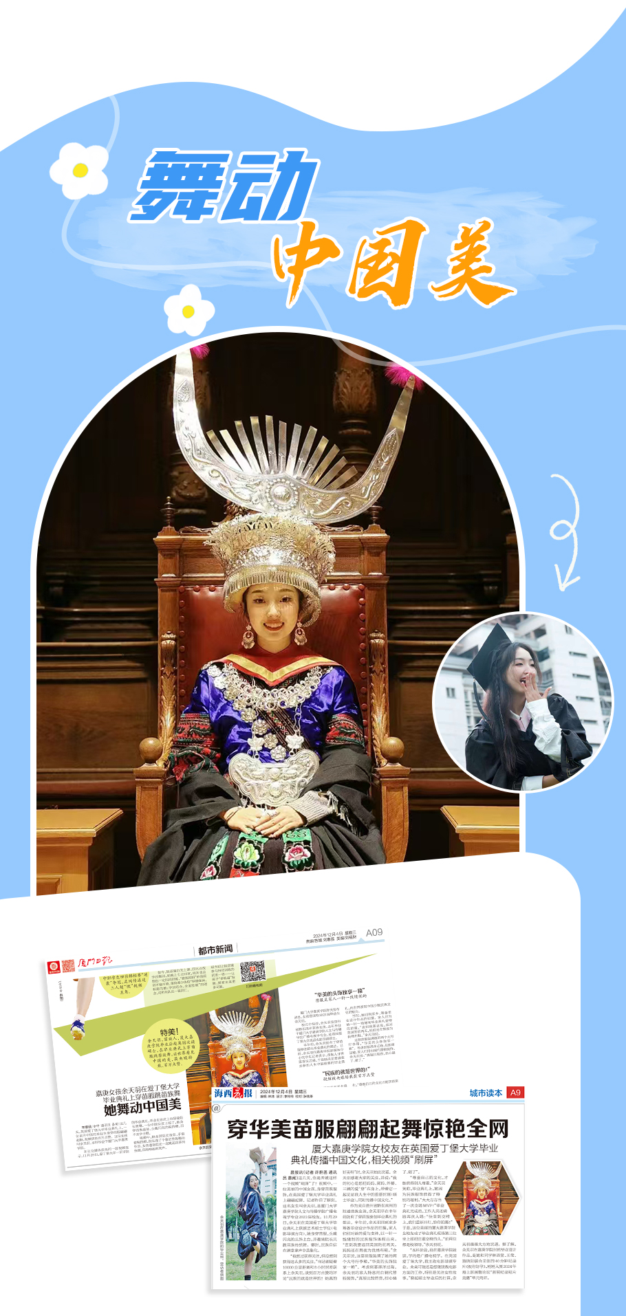 “民族的就是世界的!她真的好美呀!”11月29日,我校校友余天羽在英國(guó)愛(ài)丁堡大學(xué)畢業(yè)典禮上獲頒藝術(shù)碩士學(xué)位(電影導(dǎo)演方向)。她身穿苗服,頭戴閃亮的帽子上臺(tái),并邀請(qǐng)?jiān)洪L(zhǎng)共跳苗族傳統(tǒng)舞。這一段視頻迅速通過(guò)新華社、中國(guó)日?qǐng)?bào)、人民網(wǎng)等各大媒體,進(jìn)入大眾視野,贏得大家的心:“那一刻,民族自信在滿堂掌聲中具象化。”