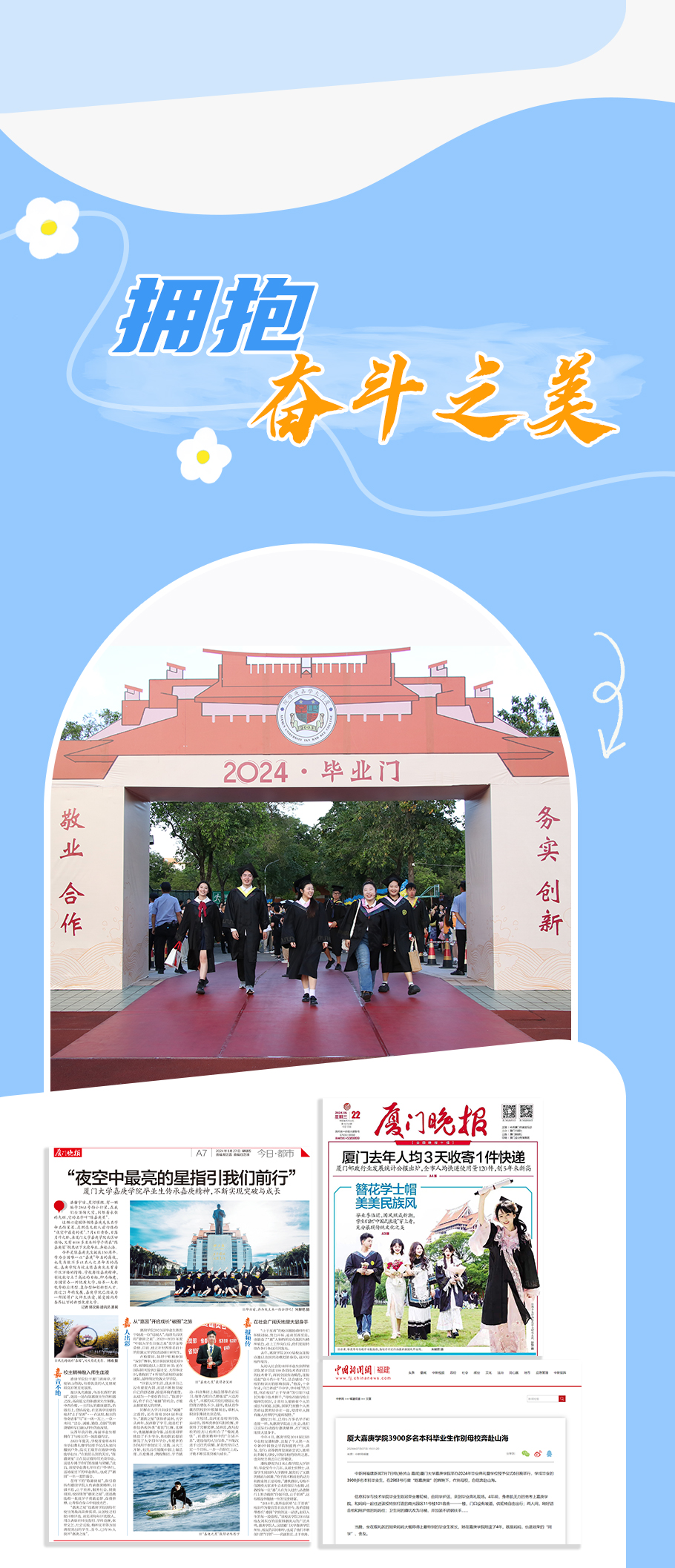 盛夏,畢業(yè)季。2024年夏天,我校3900多名本科畢業(yè)生循光而往,踏歌而行,自信奔山海。他們從“嘉園”畢業(yè),奔赴廣闊天地,去譜寫(xiě)“嘉”式精彩,擁抱奮斗之美。中國(guó)新聞網(wǎng)、學(xué)習(xí)強(qiáng)國(guó)、廈門(mén)日?qǐng)?bào)、海峽導(dǎo)報(bào)、廈門(mén)晚報(bào)等媒體(平臺(tái))在報(bào)道中特別提及王瑞芳院長(zhǎng)給予畢業(yè)生們的臨別贈(zèng)言:“敬業(yè)、合作、務(wù)實(shí)、創(chuàng)新。這8字理念引領(lǐng)著嘉庚學(xué)院走過(guò)了21年的光輝歲月。我相信,它也將引領(lǐng)你們擁抱這個(gè)變革的時(shí)代,在未來(lái)的人生旅途中,更加堅(jiān)定、自信地前行。”