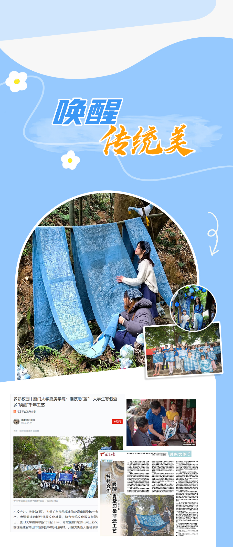 本次活動(dòng)通過(guò)四個(gè)階段的深入實(shí)踐,收獲了多元化、多層次的實(shí)踐成果,為“高校—政府—鄉(xiāng)村”三方構(gòu)架反哺家鄉(xiāng)農(nóng)產(chǎn)建設(shè)道路,同時(shí)也為年輕人關(guān)注家鄉(xiāng)現(xiàn)狀、回歸鄉(xiāng)村建設(shè)提供模式示范,獲得鄉(xiāng)政府、社會(huì)媒體、非遺工藝傳承者及當(dāng)?shù)卮迕竦亩喾胶迷u(píng)。值得一提的是,以此實(shí)踐形成的項(xiàng)目《沉‘靛’千年、青黛見(jiàn)福——福建青黛搶救性挖掘保護(hù)與活態(tài)化創(chuàng)新傳承》還獲評(píng)2024全國(guó)高校鄉(xiāng)村藝術(shù)建設(shè)年度優(yōu)秀表彰案例。