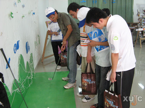 “408教室可以打高爾夫球呀?”記者聞訊趕到了408教室。果真,有不少來賓在入口的高爾夫球道上躍躍欲試。原來管理系旅游管理專業(yè)有一個高爾夫經(jīng)濟(jì)管理專業(yè)方向,因此管理系特意在展廳內(nèi)布置高爾夫球體驗(yàn)區(qū)。在來賓中,記者看到一位老者特別顯眼,原來他是廈大中文系校友,同時也是一名旅游愛好者。今天來到嘉庚學(xué)院,了解嘉庚學(xué)院管理系的情況,感到非常欣慰和自豪。