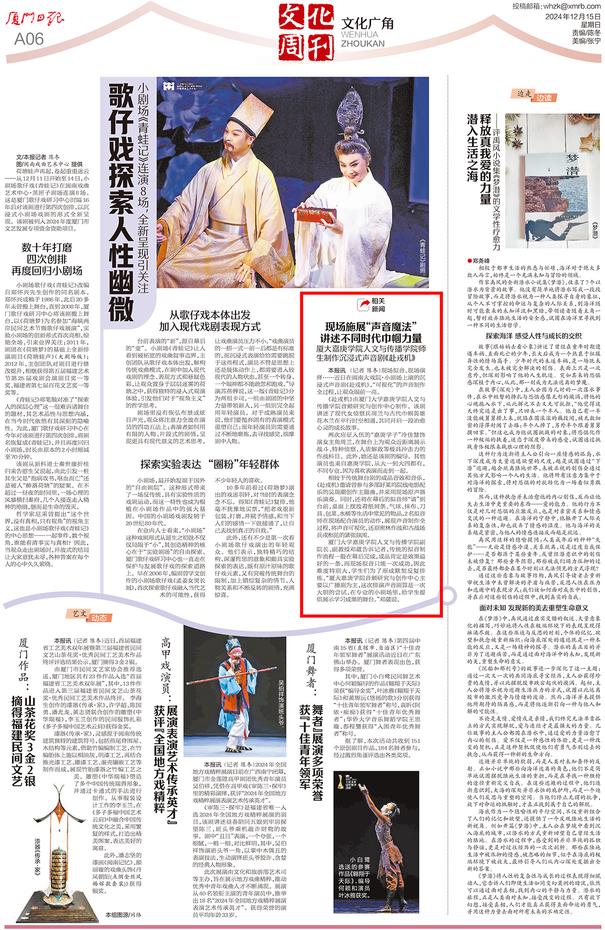 廈門大學(xué)嘉庚學(xué)院人文與傳播學(xué)院副院長(zhǎng)、副教授鄧葳告訴記者,傳統(tǒng)的擬音制作流程一般在幕后完成,成品肯定是效果最好的一條,而現(xiàn)場(chǎng)擬音只能一次成功,因此難度特別大,學(xué)生們?yōu)榱诵纬赡醴磸?fù)排練。“廈大嘉庚學(xué)院音頻研究與創(chuàng)作中心主要以廣播劇為主,這次排演聲音劇算是一次大膽的嘗試,在專業(yè)的小劇場(chǎng)里,給學(xué)生提供展示學(xué)習(xí)成果的舞臺(tái)。”鄧葳說。