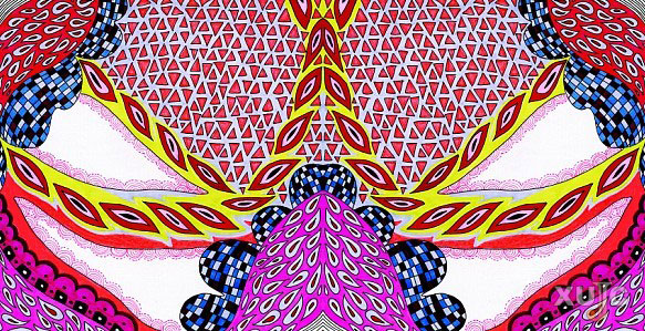 《幾何花斑》靈感來(lái)源于萬(wàn)花筒,回憶起小時(shí)候的玩具一定有它,運(yùn)用了一些幾何圖形,圖案的流線形創(chuàng)造出一些神秘色彩,追憶孩童時(shí)代的樂(lè)趣。色塊集合的一幅作品,色彩偏紫紅營(yíng)造神秘感。