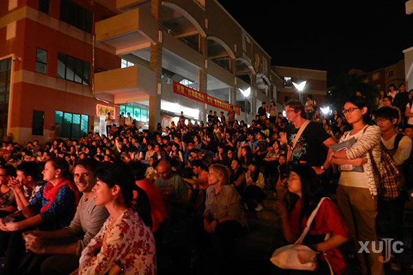 雖然沒(méi)有華麗的舞臺(tái)布景,沒(méi)有炫目的燈光,但這臺(tái)由各院系學(xué)生和中外教師同臺(tái)獻(xiàn)藝的英語(yǔ)盛會(huì),讓步行廣場(chǎng)熱鬧非凡,幾層石階和兩排60張小板凳都座無(wú)虛席,還有不少同學(xué)站著觀看。