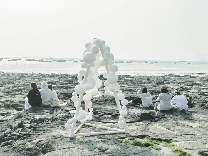 “隊(duì)員們都期待作品落地的那一刻!這期間我們共花了4周時(shí)間去設(shè)計(jì)、構(gòu)思、材料選型、模型制作等,當(dāng)作品最終呈現(xiàn)出來(lái)的時(shí)候,我們覺得持續(xù)的努力是值得的。”大學(xué)生隊(duì)員說道。這些藝術(shù)裝置有些布置在南城門的甕城內(nèi),有些布置在景觀步道上,還有些在海邊沙灘上,都是根據(jù)作品的主題和場(chǎng)地特點(diǎn)進(jìn)行布置。其中布置在海邊礁石上的泡泡球裝置,在搭建過程中就迎來(lái)一些游客打卡拍照。組員們將其命名為《漂浮》,他們?cè)O(shè)計(jì)靈感來(lái)自海洋養(yǎng)殖的泡沫浮漂,這些浮漂有些是白色的,在村里隨處可見。隊(duì)員們希望通過將浮漂回收再利用方式,將其“變廢為寶”制作為藝術(shù)裝置陳列在海邊,提醒大家對(duì)海洋環(huán)境的保護(hù)。