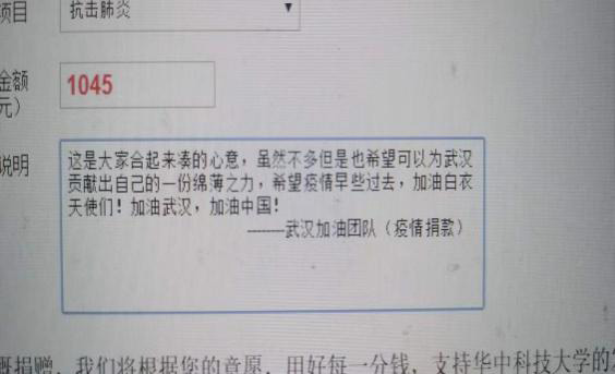 故事:發(fā)起線上募捐活動(dòng),將募捐到的1045元全部捐給華中科技大學(xué)教育發(fā)展基金會(huì)。