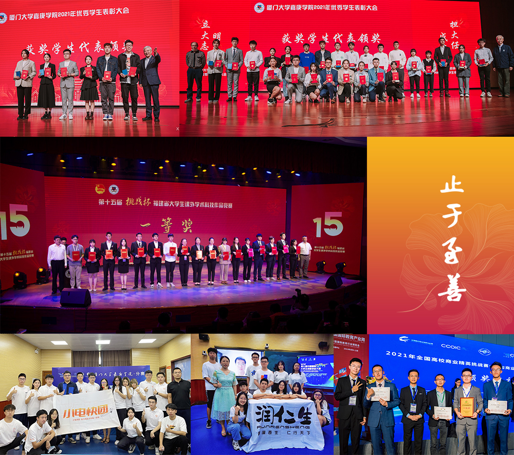 2021年,“嘉”人們繼續(xù)秉承“止于至善”的校訓(xùn),在學(xué)習(xí)、科研、實(shí)踐、競賽、文體公益活動(dòng)等各方面取得優(yōu)異的成績,獲10247項(xiàng)校級以上獎(jiǎng)項(xiàng),包括國家獎(jiǎng)學(xué)金(25人),國家勵(lì)志獎(jiǎng)學(xué)金(150人),福建省“向上向善育人工程基金”項(xiàng)目獎(jiǎng)學(xué)金(20人),校級獎(jiǎng)學(xué)金(9378人次),“嘉庚之星”(6名)、“優(yōu)秀三好學(xué)生”“三好學(xué)生”及“優(yōu)秀學(xué)生干部”等。其中,我校學(xué)子在全國各大賽事中捧回市級及以上的獎(jiǎng)項(xiàng)近400個(gè):在第七屆中國國際“互聯(lián)網(wǎng)+”大賽中,斬獲國賽2銀3銅;在第十四屆全國大學(xué)生節(jié)能減排社會(huì)實(shí)踐與科技競賽中,斬獲全國二等獎(jiǎng)1項(xiàng)、三等獎(jiǎng)4項(xiàng);在于我校舉辦的第十五屆“挑戰(zhàn)杯”福建省大學(xué)生課外學(xué)術(shù)科技作品競賽中,獲2個(gè)特等獎(jiǎng)、2個(gè)一等獎(jiǎng)……