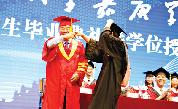 從7月7日開始,廈大嘉庚學院舉行畢業(yè)典禮,送別2018屆的4133名畢業(yè)生。一天三場,連開三天,校長王瑞芳笑容不改,站姿不變,堅持每一場站立1個多小時,完成與每位畢業(yè)生的執(zhí)手握別,親手為每一位畢業(yè)生撥正學位帽流蘇。自2007年擁有首屆畢業(yè)生以來,這個儀式在廈大嘉庚學院堅持了12年。